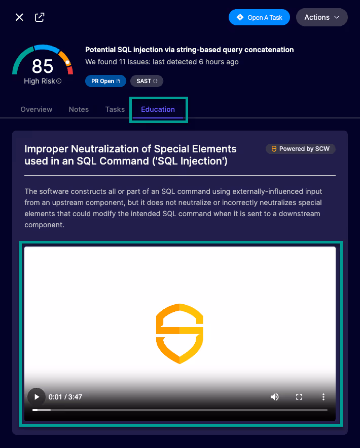 Transformez votre approche des logiciels sécurisés. Notre site pratique Learning Platform permet aux partenaires de créer du code sécurisé dès le début du développement et de s'attaquer aux problèmes récurrents d'une manière plus engageante et plus efficace. Découvrez l'impact durable que notre solution peut avoir sur vos projets.